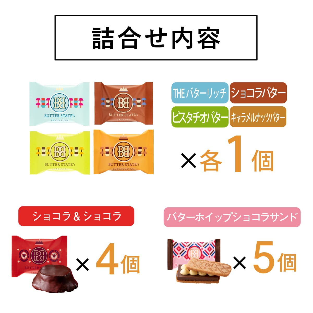 | 内容 | ●THEバターリッチ・ショコラバター・ピスタチオバター・キャラメルナッツバター 各1個 ●ショコラ&ショコラ 4個 ●バターホイップショコラサンド 5個 |