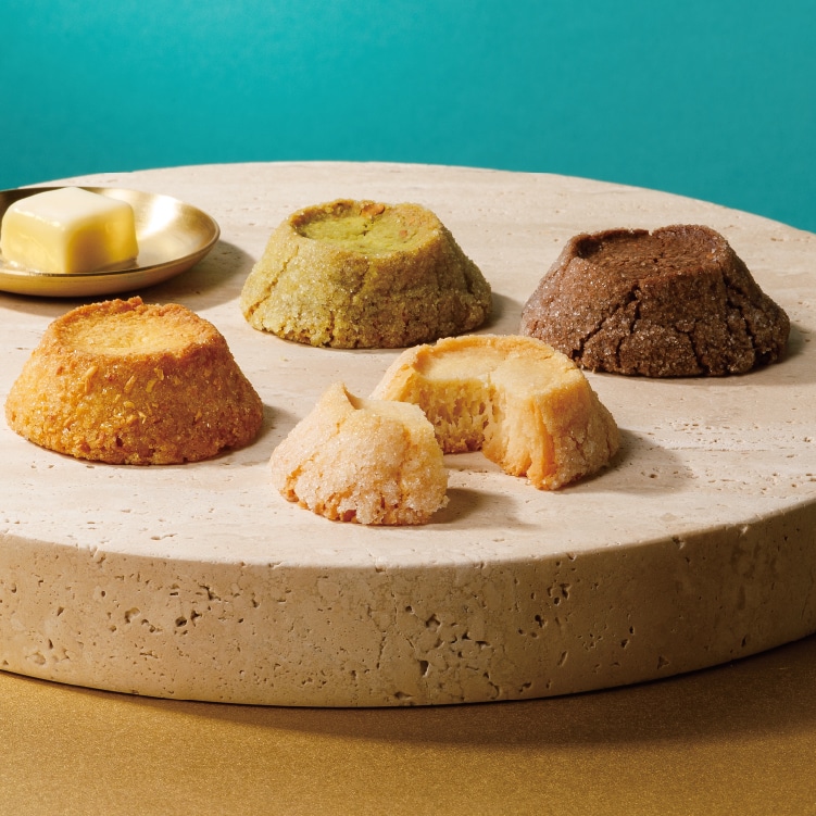 バターの頂きから“なだれとろける”窯の熱でバターが溢れとろける「バターなだれとろけ製法」で香ばしく焼き上げました。生地に極限までたっぷり練りこんだバターが、なだれとろけた瞬間で焼きとめたこの形は、自然にうまれたおいしさの形です。