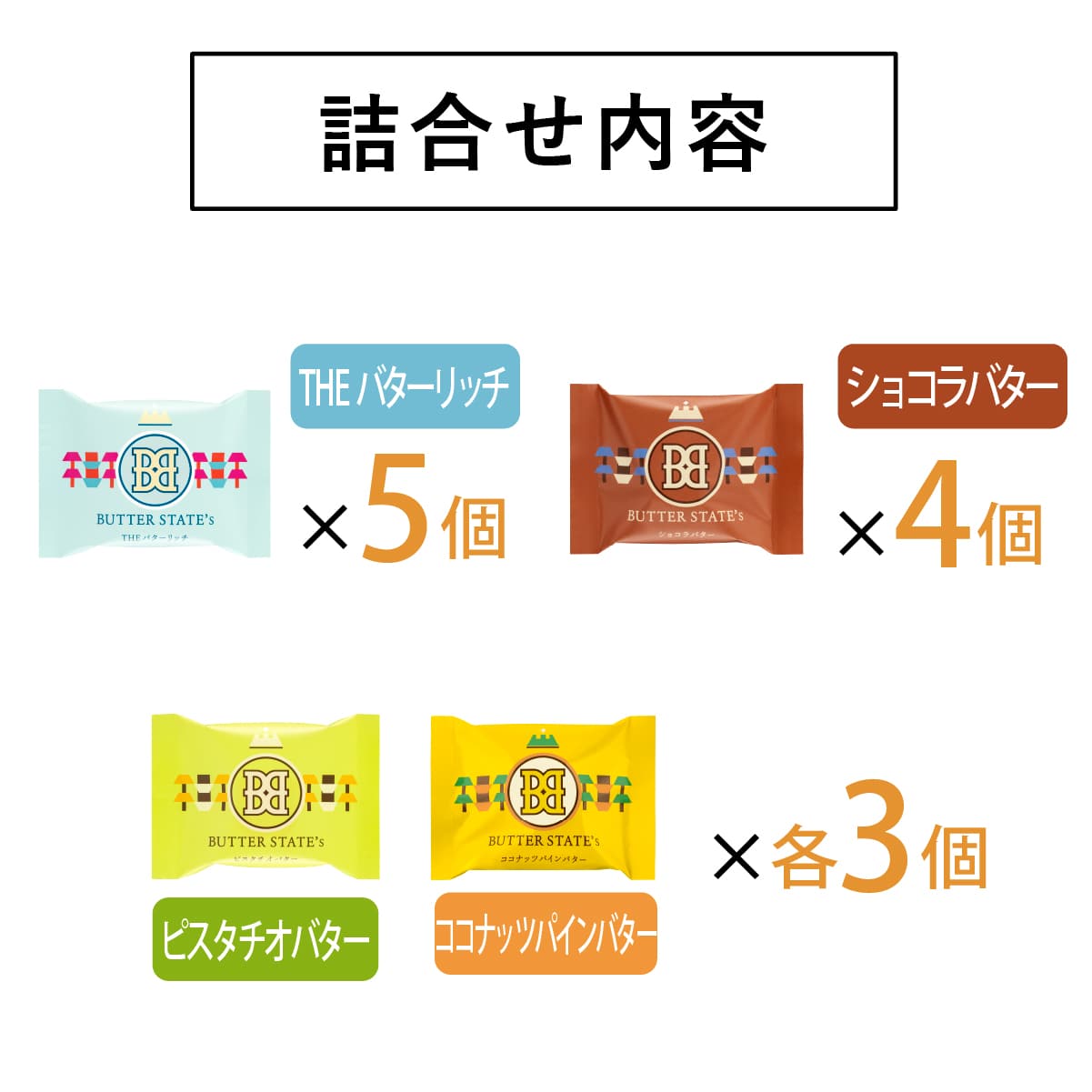 | 内容 | THEバターリッチ 5個 ショコラバター 4個 ピスタチオバター・ココナッツパインバター 各3個 |
