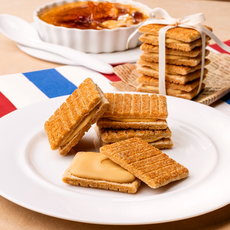 国産生乳のキャラメルパウダーを練り込んだ特製キャラメルショコラを、パリッとブリュレ仕立てのバターキャラメル生地でサンドしました。サクッとかじると、口いっぱいにキャラメルのコクと香ばしさが広がります。