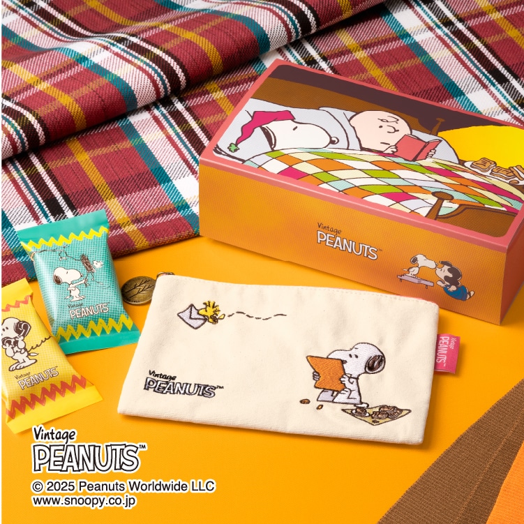 「スヌーピー シュガーバターサンドの木」と「スヌーピー シュガーバターサンドの木 蜜いもメープルバター仕立て」、2つの味をお楽しみいただける詰合せ。かわいいオリジナルポーチ付きのセットです。
