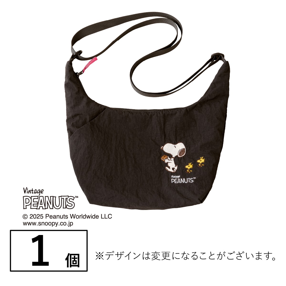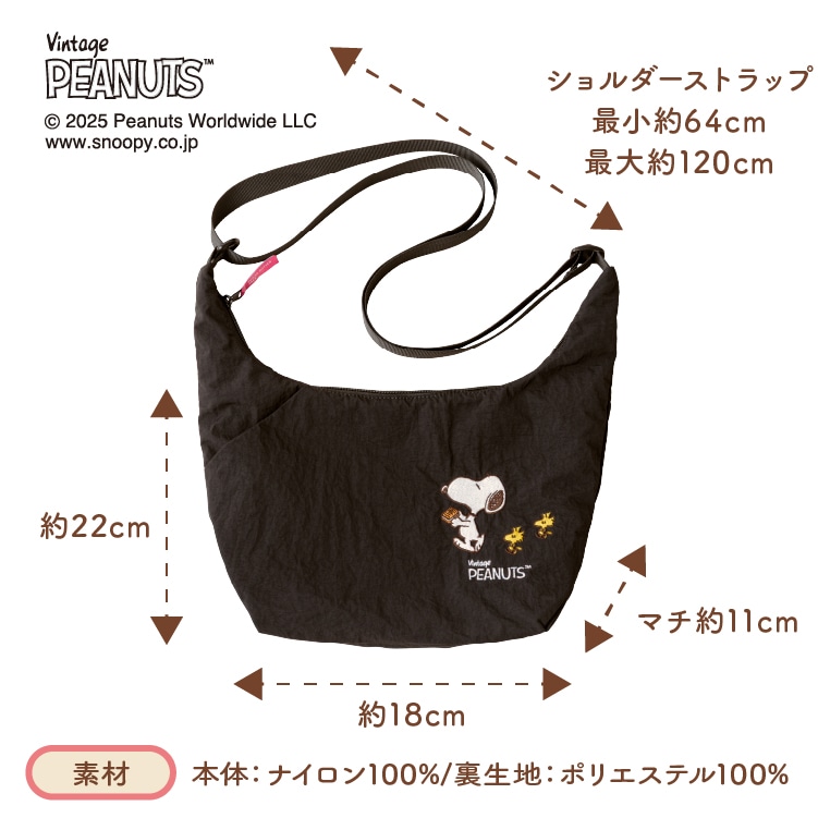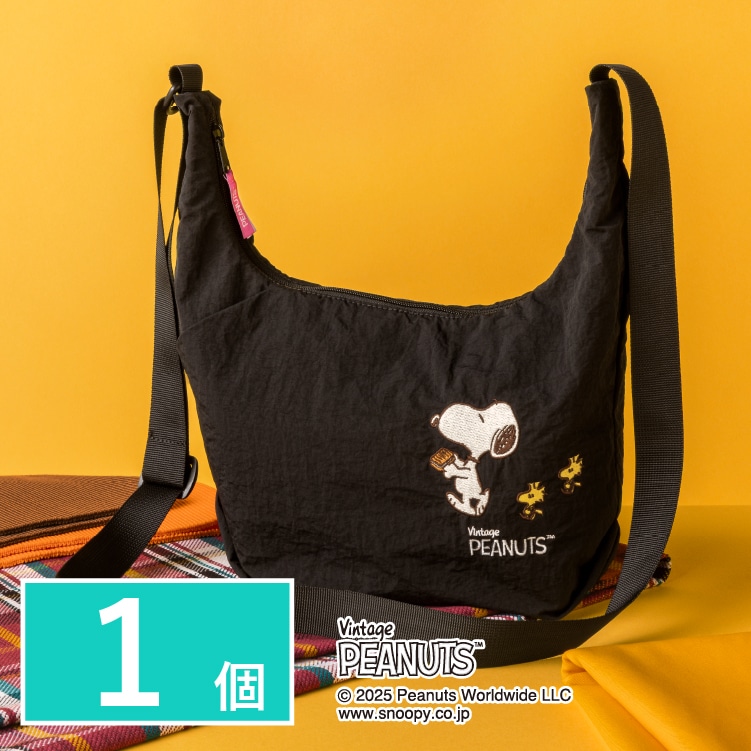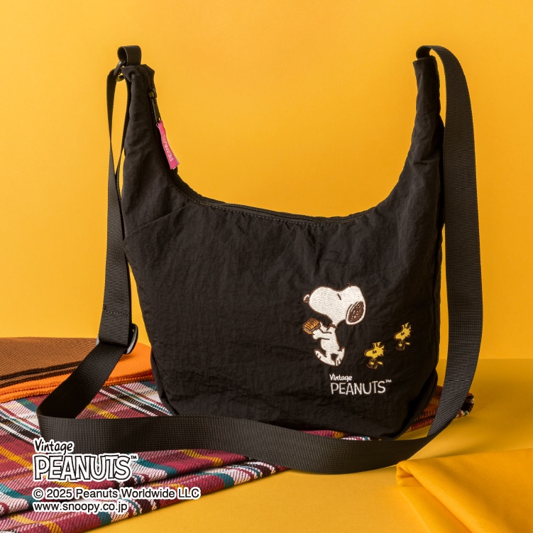 オリジナルショルダーバッグコラボだけのショルダーバッグ誰でも使いやすいブラックカラーのショルダーバッグ。スヌーピーとウッドストックのさりげない刺繍がおしゃれ!