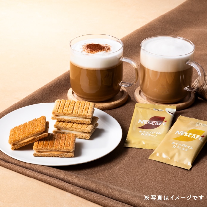 お湯を注ぐだけで濃厚リッチな泡が出来るコーヒー「ネスカフェ ホイップタイム」と、 バターの香る特製シリアル生地のショコラサンド「シュガーバターの木」がセットで楽しめる詰合せです。