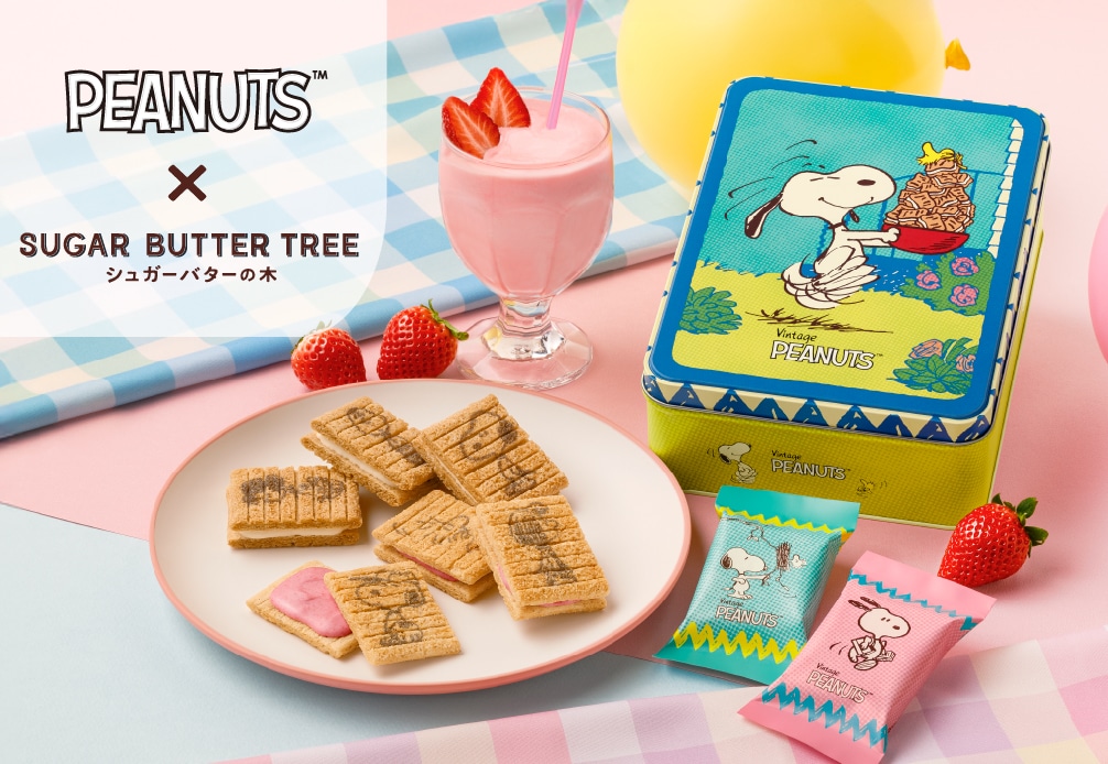 ブランド誕生15周年を迎えた「シュガーバターの木」とコミック誕生75周年を迎えた「PEANUTS」がコラボレーション!"しあわせというのは、ただ君のとなりにいるということ"をテーマに、みんなのしあわせに寄り添う特別なシュガーバターの木が出来ました。個性豊かな「PEANUTS」の仲間たちがいつも一緒にいるように、シュガーバターの木もいつもあなたに寄り添って、ホッとやすらぐおいしいひとときを提供します。