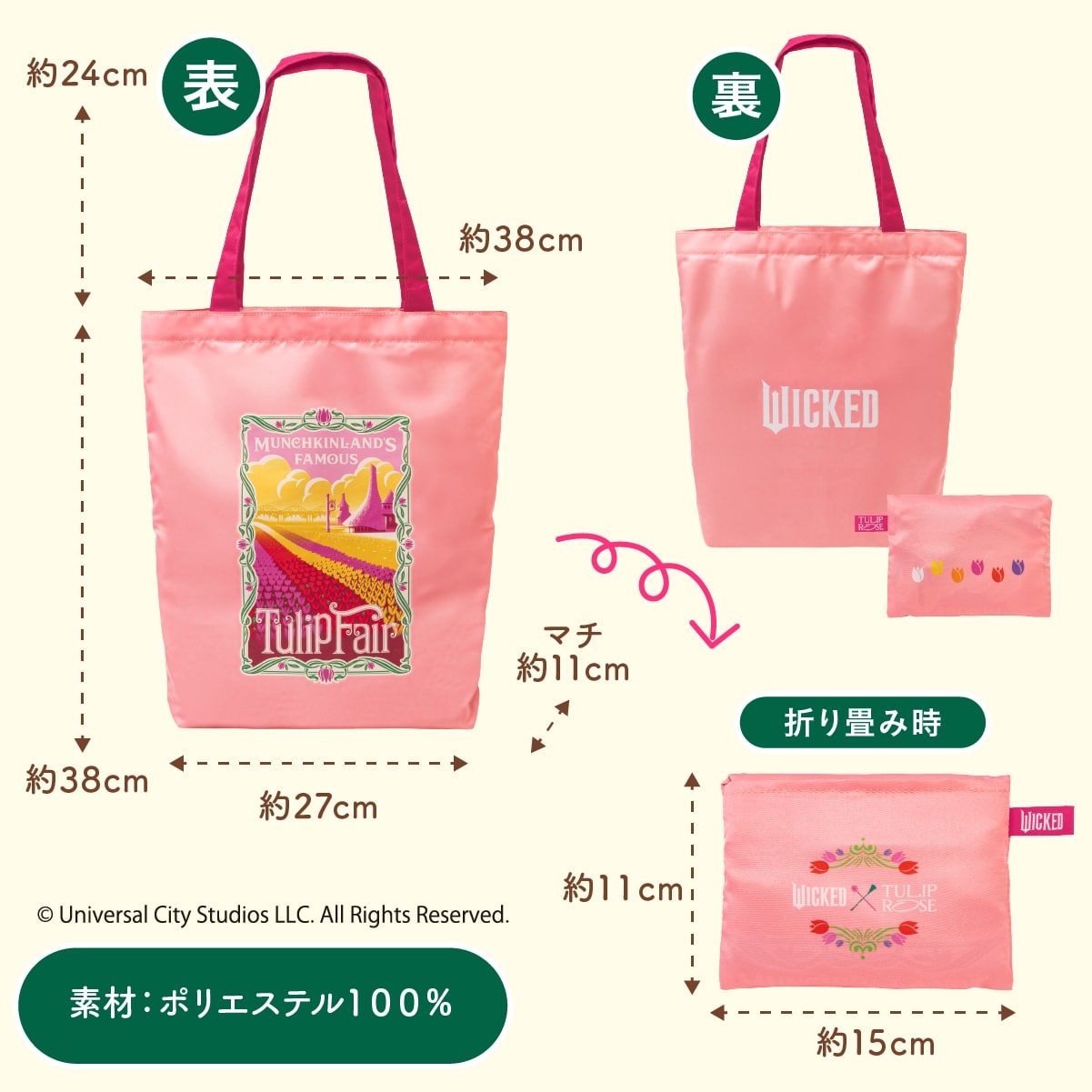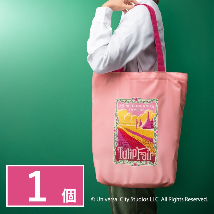 チューリップローズ〈WICKED〉エコバッグ映画『ウィキッド 永遠の約束』の舞台の一部であるマンチキンランドに広がるチューリップ畑を華やかに描いたエコバッグです。鮮やかなピンク色は、持っているだけでおしゃれな印象に。小さく折りたためるので、持ち運びにぴったり! -
