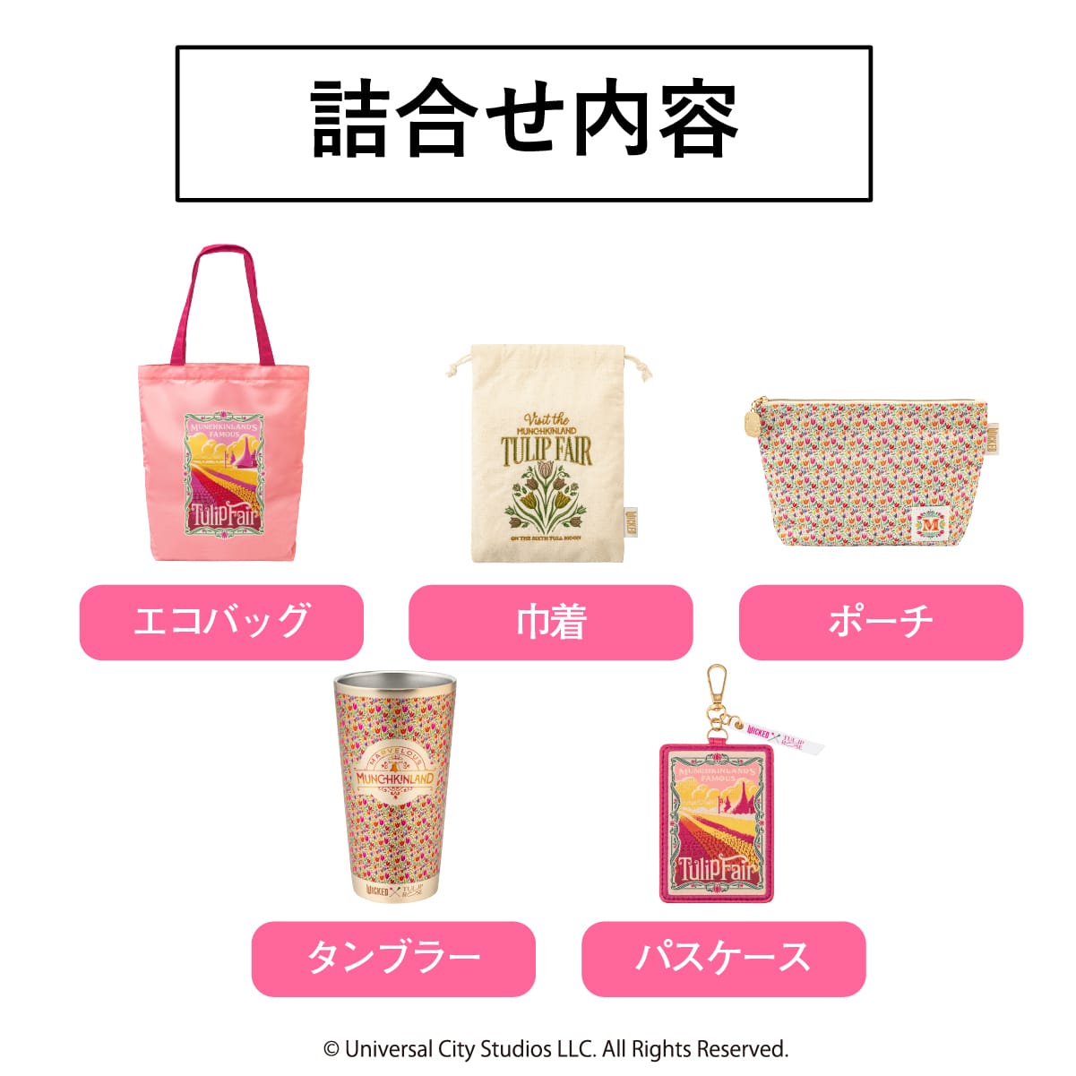 | 内容 | ●チューリップローズ <WICKED> エコバッグ 1個 ●チューリップローズ <WICKED > ポーチ 1個 ●チューリップローズ <WICKED> ステンレスタンブラー 1個 ●チューリップローズ <WICKED> パスケース 1個 ●チューリップローズ <WICKED> 巾着 1個 |