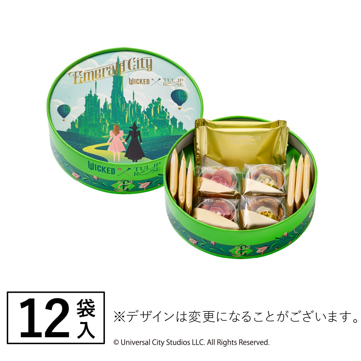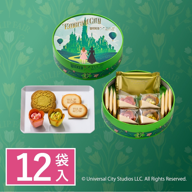 物語の世界観を表現したスペシャルボックス物語の舞台のひとつであるエメラルドシティーへ向かうような、主人公のふたり「グリンダ」と「エルファバ」が描かれたボックスに、「TOKYOチューリップローズ」のお菓子を詰め込みました。いつまでも飾っておきたくなるような、おしゃれで素敵なデザインです。