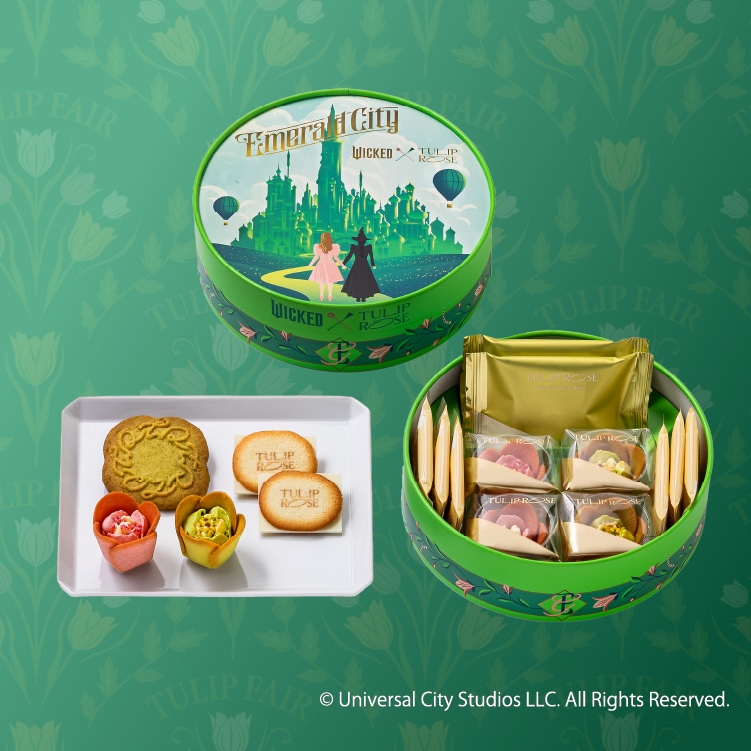 チューリップローズ WICKED edition「TOKYOチューリップローズ」と映画『ウィキッド 永遠の約束』がコラボ!主人公のふたりのシンボルカラーを思わせる、グリーンピスタチオとピンクストロベリーの「チューリップローズ」のほか、「TOKYOチューリップローズ」のおしゃれでおいしいお菓子がお楽しみいただけます。 -