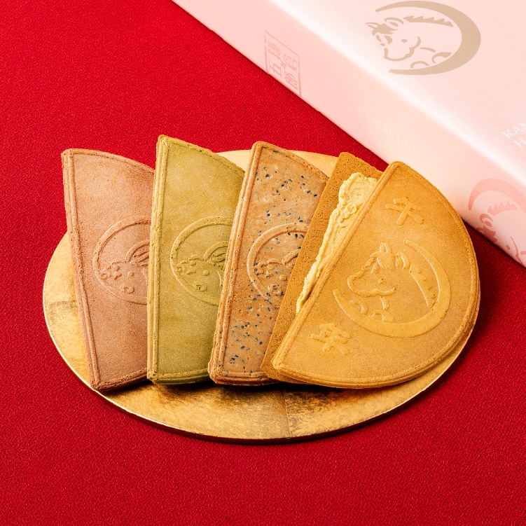 パリンッと香ばしく焼きあげたサクサク生地に、ふんわり軽やかなクリームをはさんだゴーフレットせんべい「鎌倉半月」。シーンを選ばずに幅広くご利用いただける万能ギフトとして、愛され続けています。定番の抹茶、小倉味に加えて新年限定の「午年半月(栗きんとん味)」も入った季節の詰合せです。