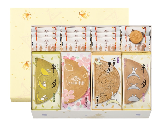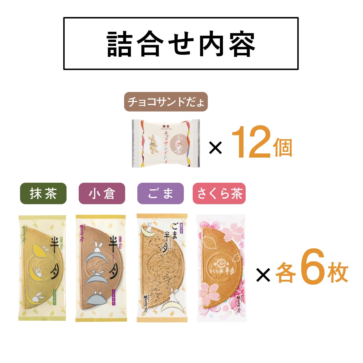 | 内容 | ●鎌倉半月/抹茶・小倉 各6枚 ●鎌倉さくら茶半月 6枚 ●鎌倉ごま半月 6枚 ●鎌倉チョコサンドだょ 12個 |