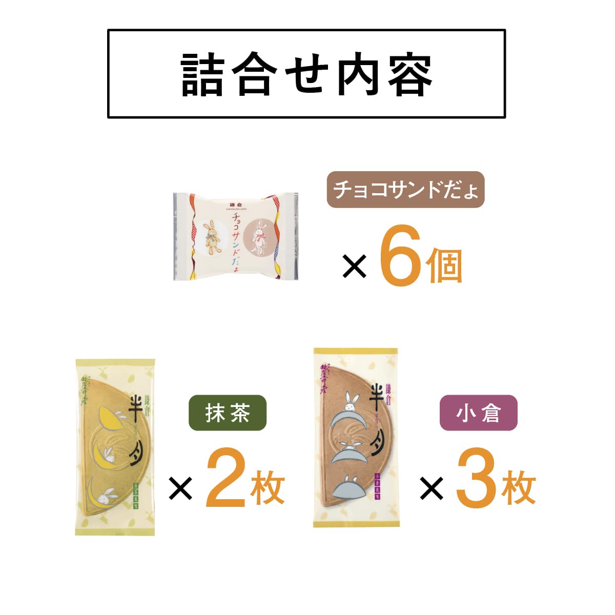 内容 ●鎌倉半月/抹茶 2枚・小倉 3枚 ●鎌倉チョコサンドだょ 6個