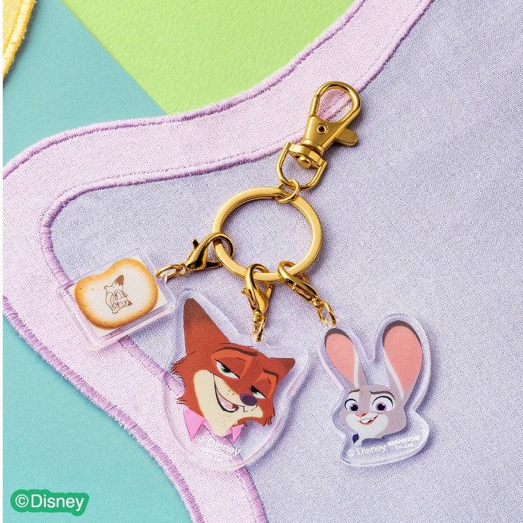 3種のアクリルチャームが付いたキーホルダー。「ニック」と「ジュディ」、お菓子のチャームが付いたここだけのオリジナルです。バッグや鍵につけたり、ひとつずつ分けて使えるので、大切なお友達と分けて使うのも◎