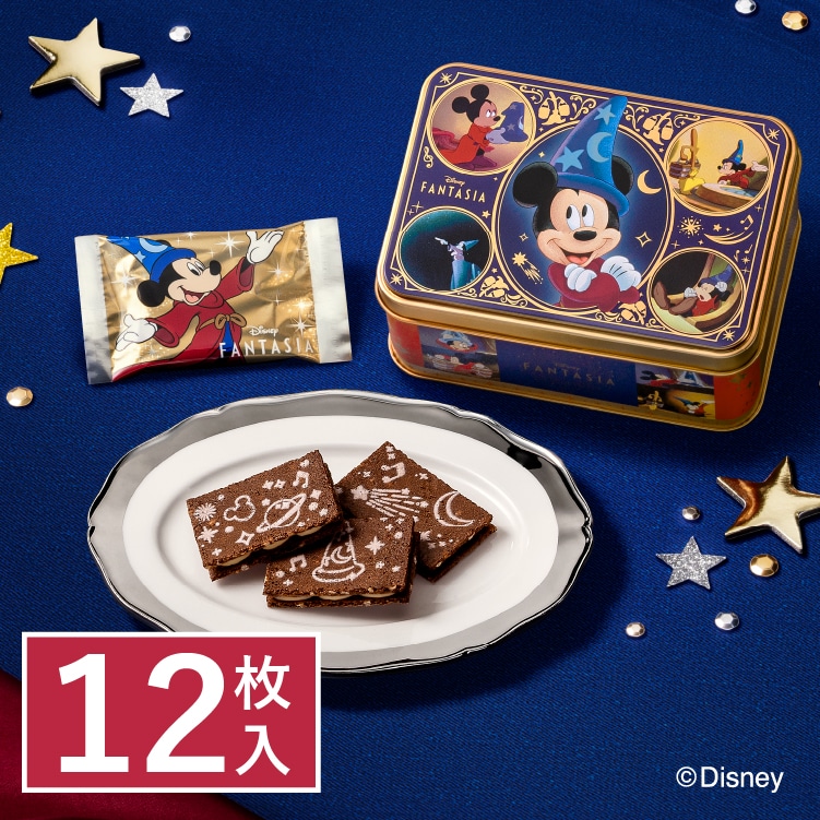 お菓子にも映画の世界観を詰め込みました。ディズニー映画『ファンタジア』公開85周年をお祝いする、夜空の星のように“ブロンド色”に輝くチョコレートをはさんだクッキーサンドです。まろやかにとろけるショコラとチョコナッツ生地の甘く香ばしいハーモニーを楽しんで!