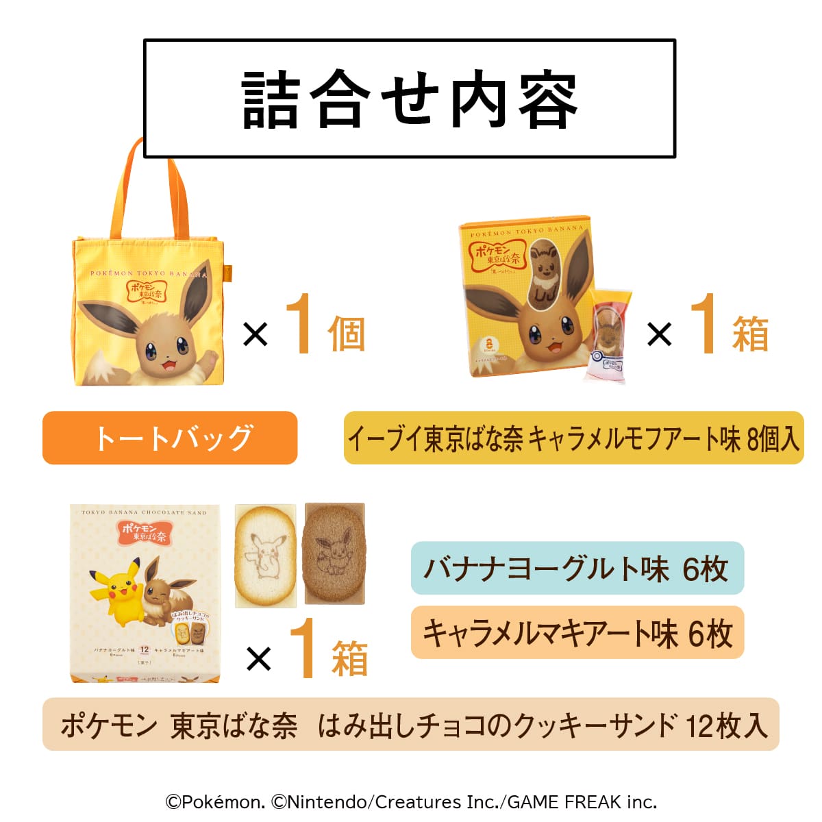 | 内容 | ●イーブイ東京ばな奈「見ぃつけたっ」キャラメルモフアート味 8個入 ●ポケモン東京ばな奈 はみ出しチョコのクッキーサンド 12枚入 ●ポケモン東京ばな奈 イーブイトートバッグ 1個 |