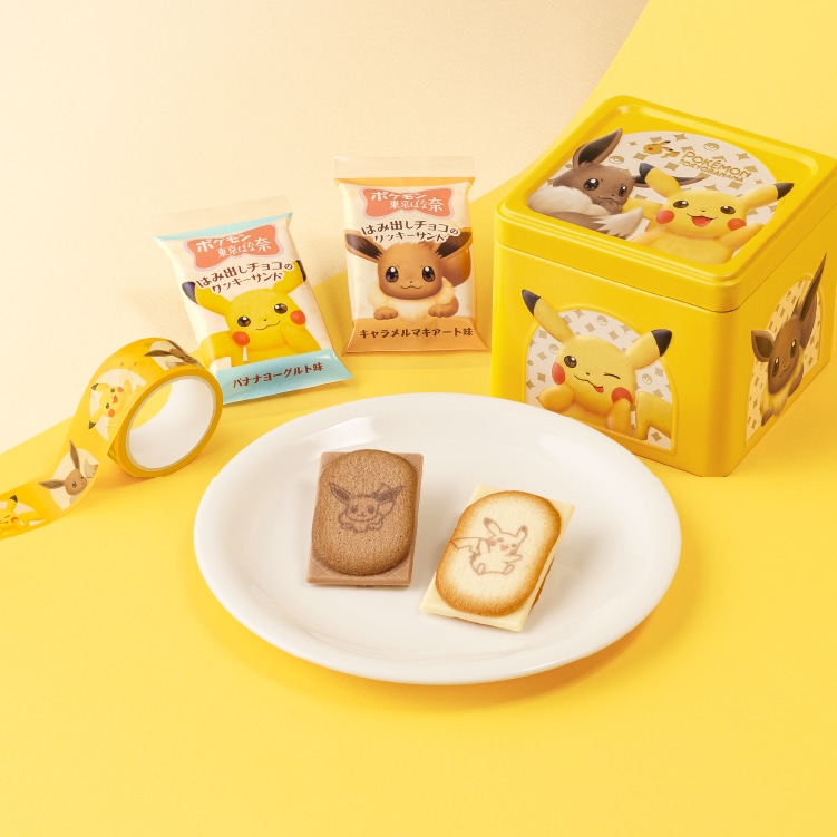 ピカチュウとイーブイデザインがとってもかわいい!シャリシャリッと軽やかに香ばしく焼きあげたラングドシャクッキーに、バナナヨーグルト味とキャラメルマキアート味の2つのおいしさをIN。お菓子も、パッケージも、ポケモンづくしのクッキーサンドを召し上がれ!