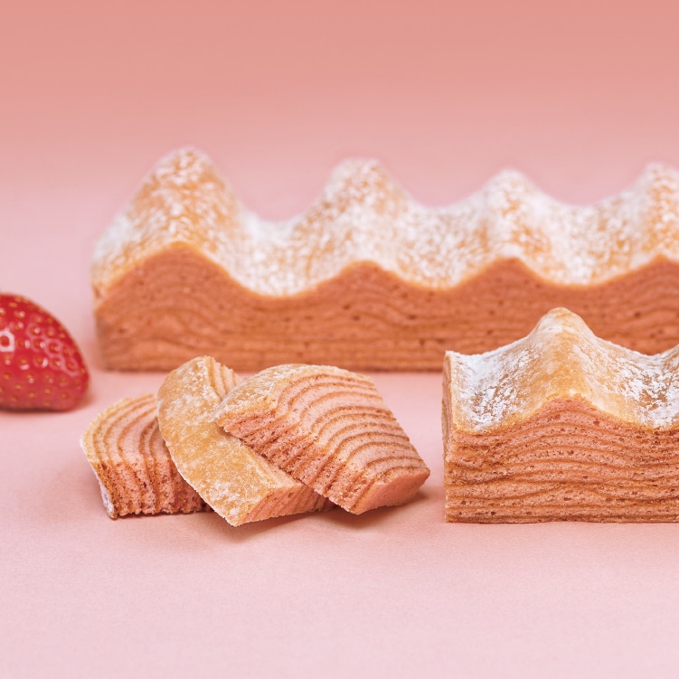 福岡県産あまおう苺のペーストとパウダーを練り込んだ生地を一層一層じっくり丁寧に焼きあげた、春色のバームクーヘン。ホワイトショコラをブレンドし、コク豊かでミルキーな味わいに。華やかな苺と芳醇バターの香りが広がる春限定の味をお楽しみください。