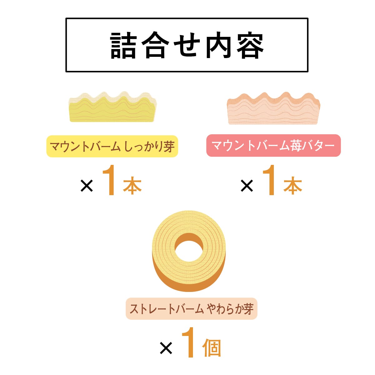 | 内容 | ●ストレートバーム やわらか芽 1個 ●マウントバーム 苺バター 1本 ●マウントバーム しっかり芽 1本 |