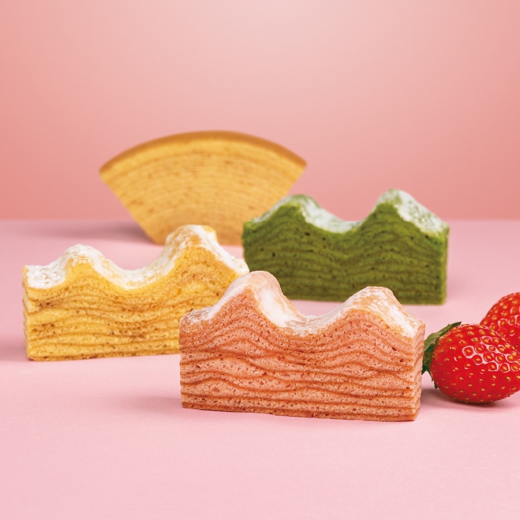 福岡県産あまおう苺のペーストとパウダーを練り込んだ生地を一層一層じっくり丁寧に焼きあげた、春色のバームクーヘン。ホワイトショコラをブレンドし、コク豊かでミルキーな味わいに。華やかな苺と芳醇バターの香りが広がる春限定の味をお楽しみください。