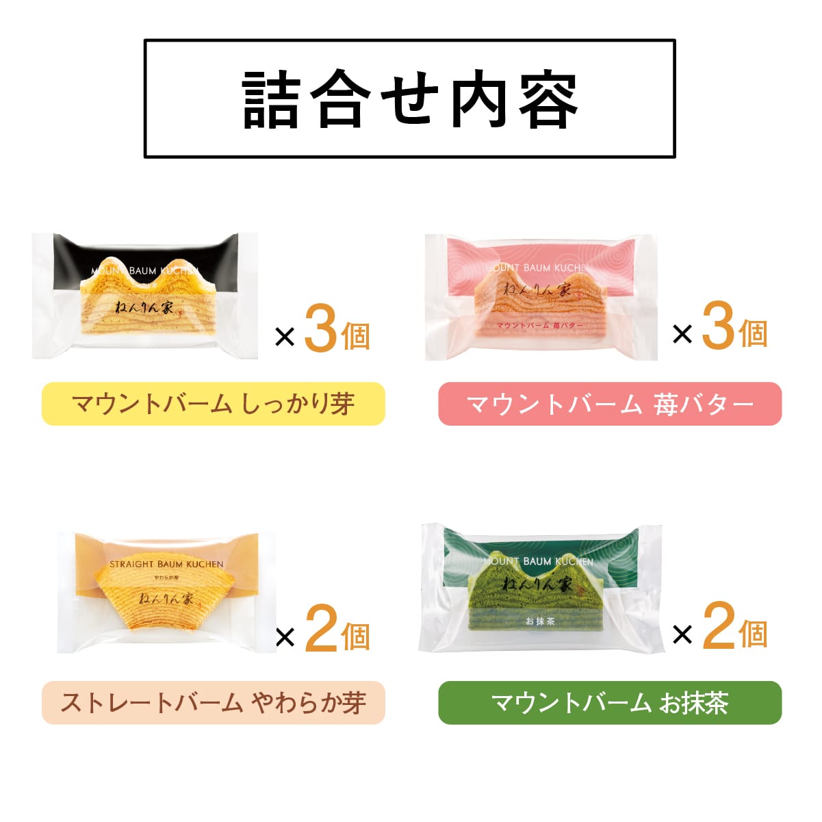 〈ねんりん家〉を代表する2種の定番バームに、春限定の「マウントバーム 苺バター」、人気の「お抹茶」を詰合せたギフトボックス。食べやすいひとくちサイズのバームクーヘンは、食べ比べや贈り物にもおすすめです。