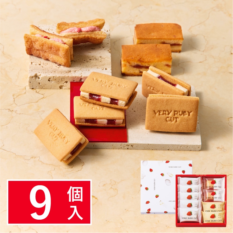 いちごとホワイトショコラがとろっととろける代表作 「いちごミルクサンド」と、あまおう苺100%のコンフィチュールを使った「いちごチーズケーキ」、さわやかな酸味の苺クリームを挟んだ「いちごクリームパイ」が入った、VERY RUBY CUTの魅力をたっぷり楽しめる詰合せです。