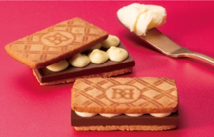 濃厚なバターの香りとほろ苦いココアの香りが楽しめるショコラバタークッキーに、とろけるショコラを流しました。チョコレート好きにはたまらない逸品です。