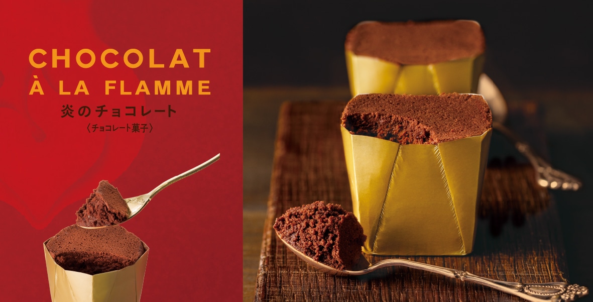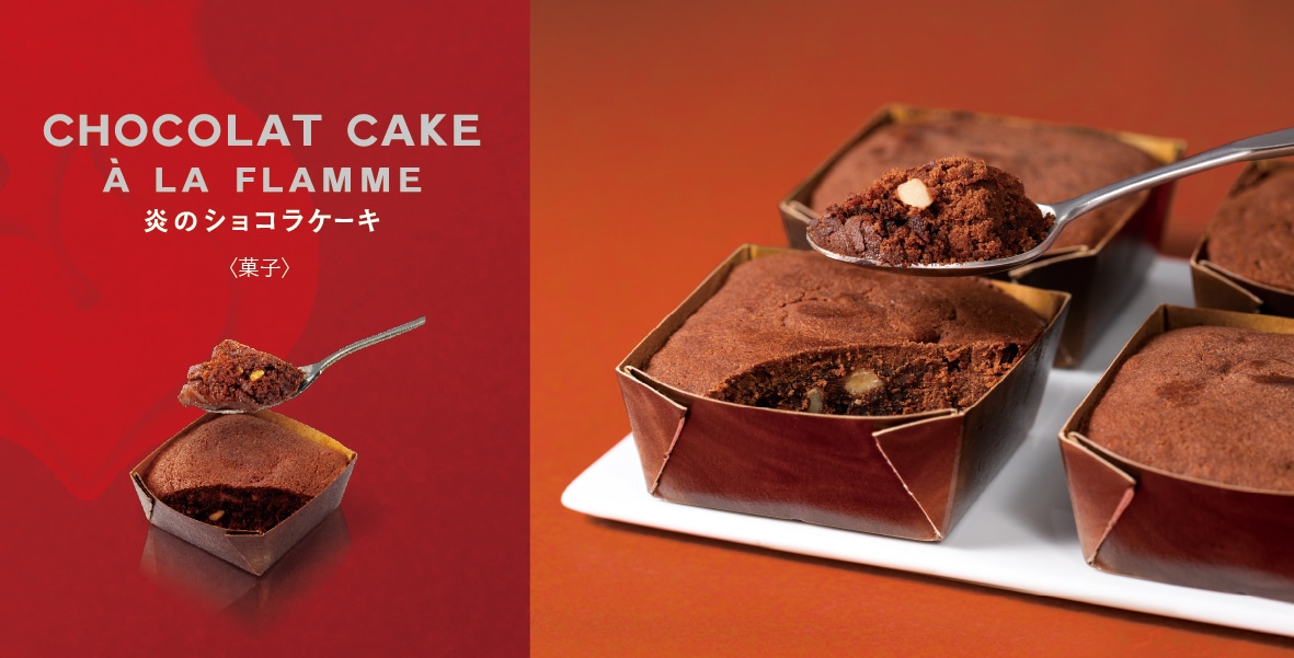 炭火ショコラにビターショコラとガナッシュを合わせ、炎でとろとろ焼き蒸しました。コク深くキレのあるショコラ、芳醇なカカオの香りが、忘れられない口どけとともに押し寄せます。