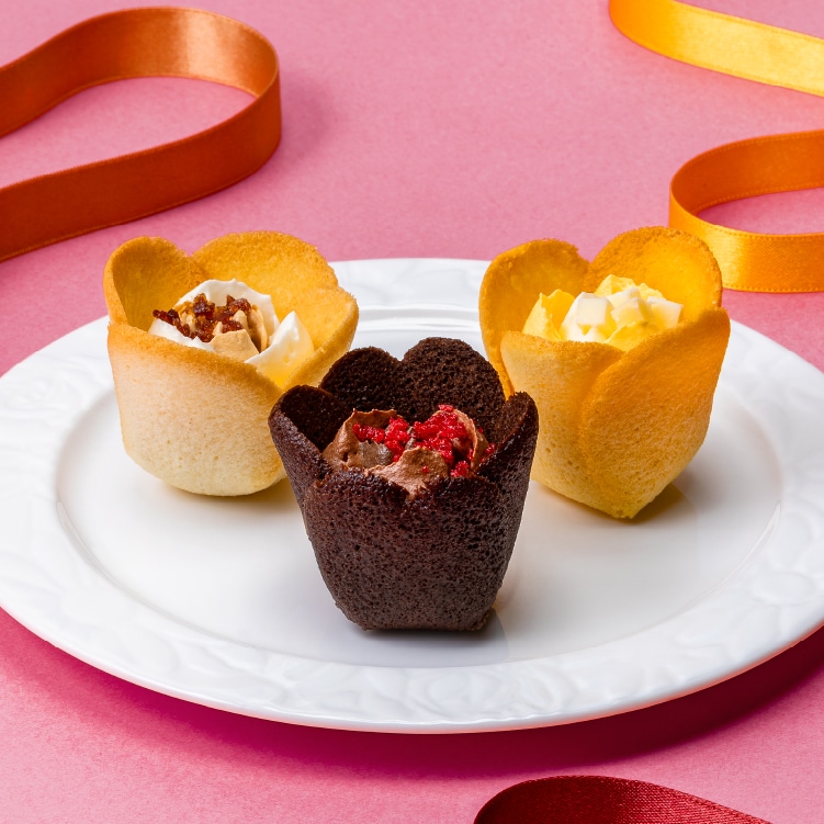 様々な食感や風味を楽しめるラングドシャクッキーの花びらを1〜2枚摘みとると食べやすくなり、一層おいしくお召し上がりいただけます。軽やかな歯ごたえのクッキー、なめらかなクリーム、サクサクのパイがあわさる、食感や風味のマリアージュをお楽しみください。 -