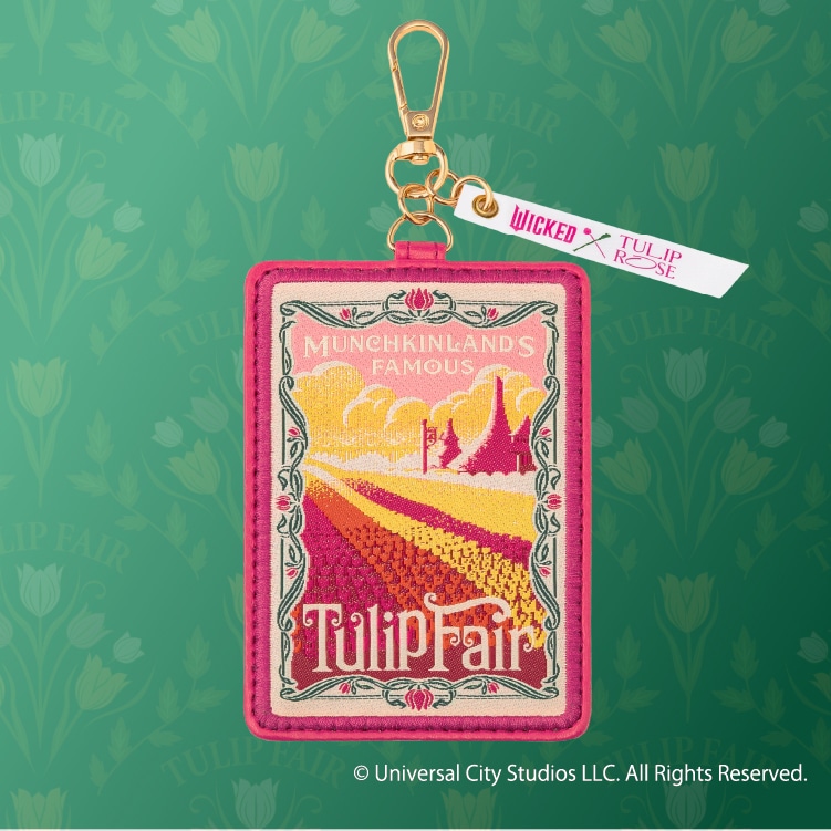 映画『ウィキッド 永遠の約束』の舞台の一部であるマンチキンランドに広がる華やかなチューリップ畑が描かれたパスケースです。