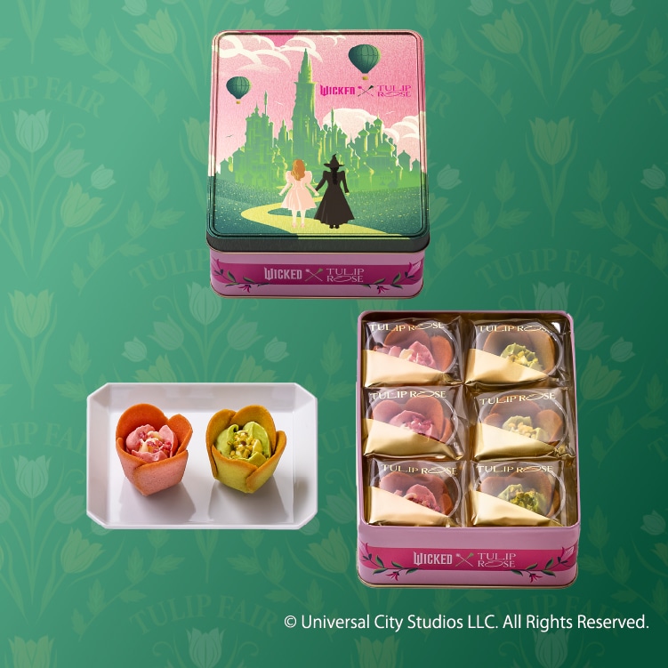 「TOKYOチューリップローズ」と映画『ウィキッド 永遠の約束』がコラボ!中にはふたりのシンボルカラーを思わせる グリーンピスタチオとピンクストロベリーの「チューリップローズ」が。 「TOKYOチューリップローズ」ならではのコラボをお楽しみください。