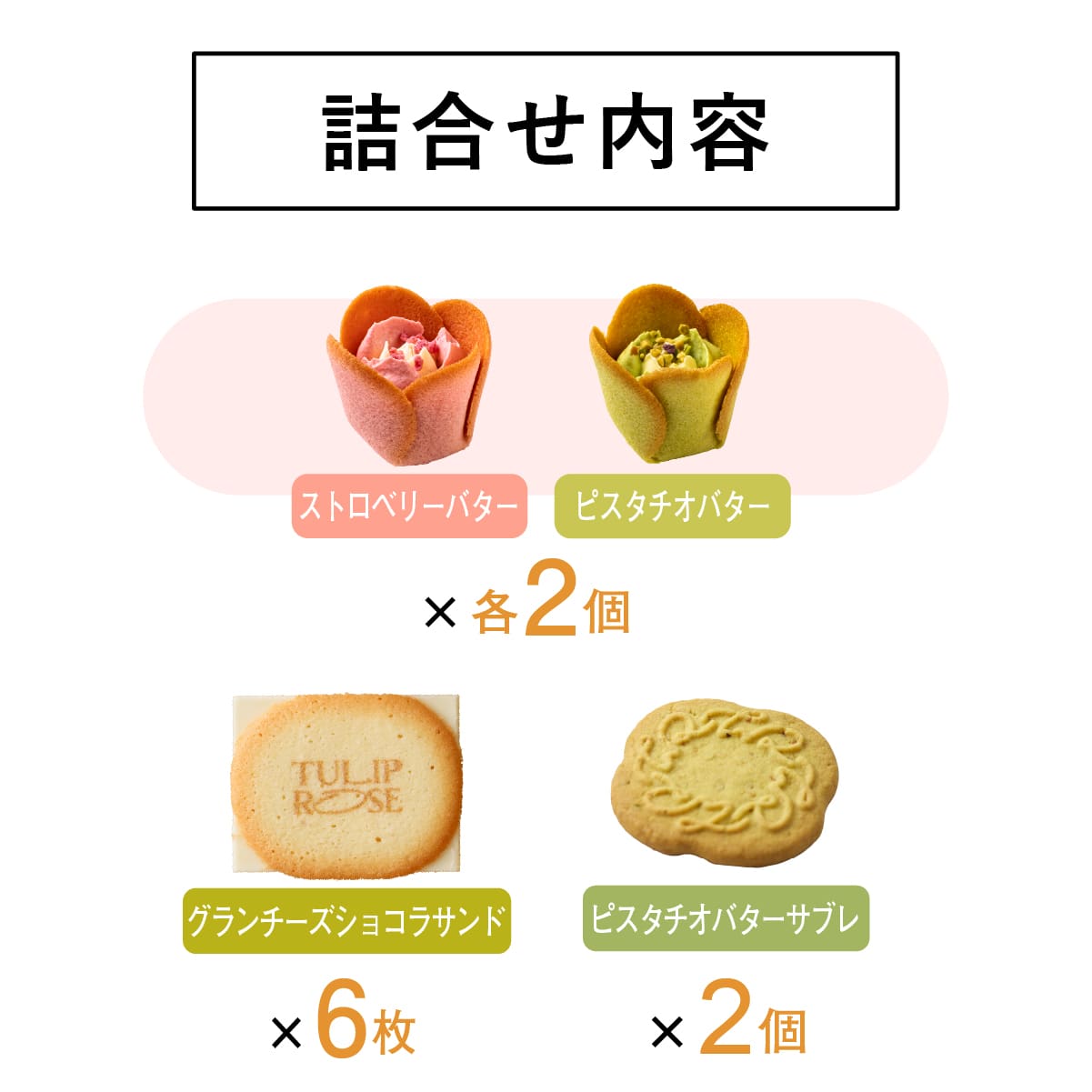 | 内容 | ●チューリップローズ/ストロベリーバター・ピスタチオバター 各2個 ●グランチーズショコラサンド 6枚 ●ピスタチオバターサブレ 2個 |