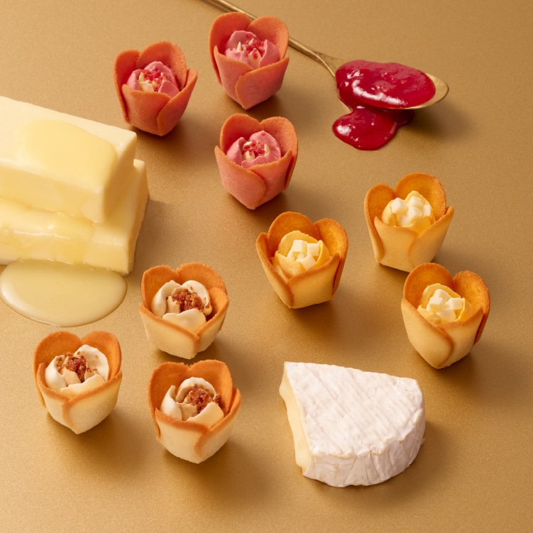 おいしさと美しさを両立させる製法ランドグシャクッキーをわずか7秒でチューリップへと形作る独自の製法や、なめらかな口どけのままバラの形にクリームを絞る精巧な技術から生まれる美しさが、おいしさをより一層引き立てます。