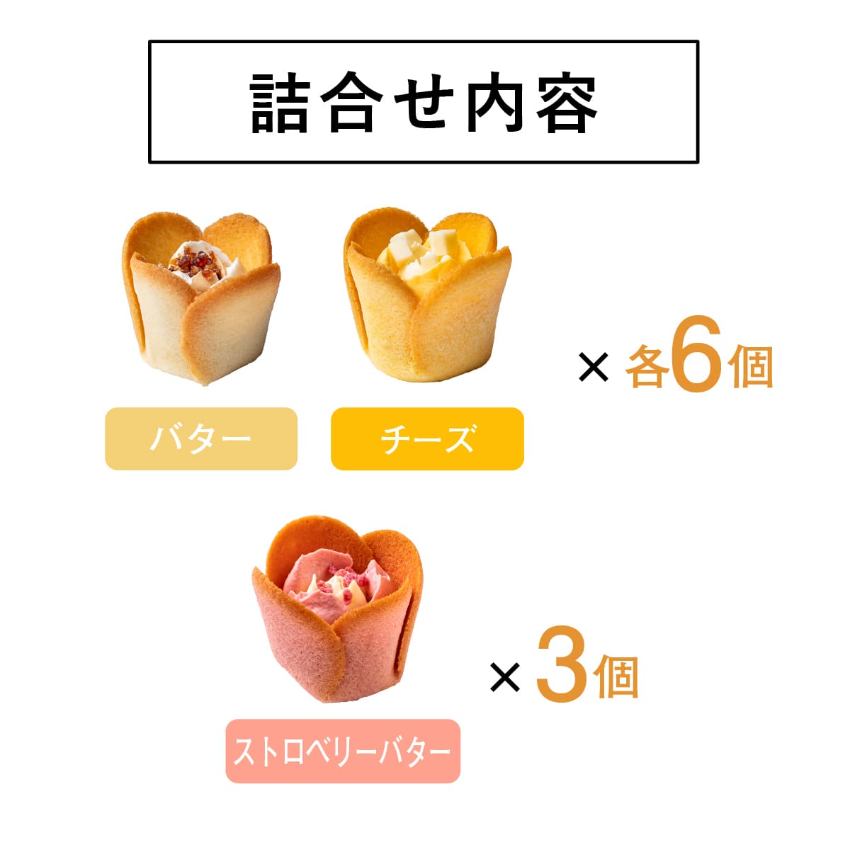 | 内容 | ●チューリップローズ バター・チーズ 各6個 ●チューリップローズ ストロベリーバター3個 |