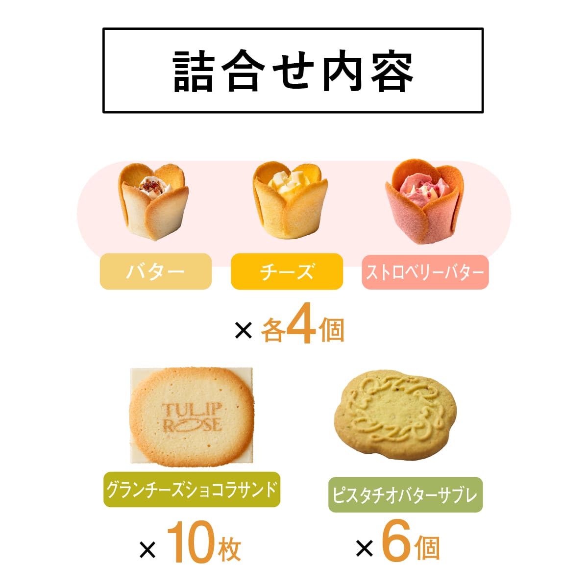 内容 ●チューリップローズ/バター・チーズ・ストロベリーバター 各4個 ●グランチーズショコラサンド 10枚 ●ピスタチオバターサブレ 6個