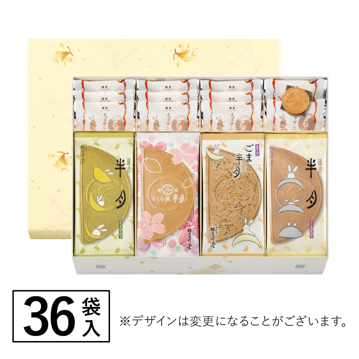 | 内容 | ●鎌倉半月/抹茶・小倉 各6枚 ●鎌倉さくら茶半月 6枚 ●鎌倉ごま半月 6枚 ●鎌倉チョコサンドだょ 12個 |