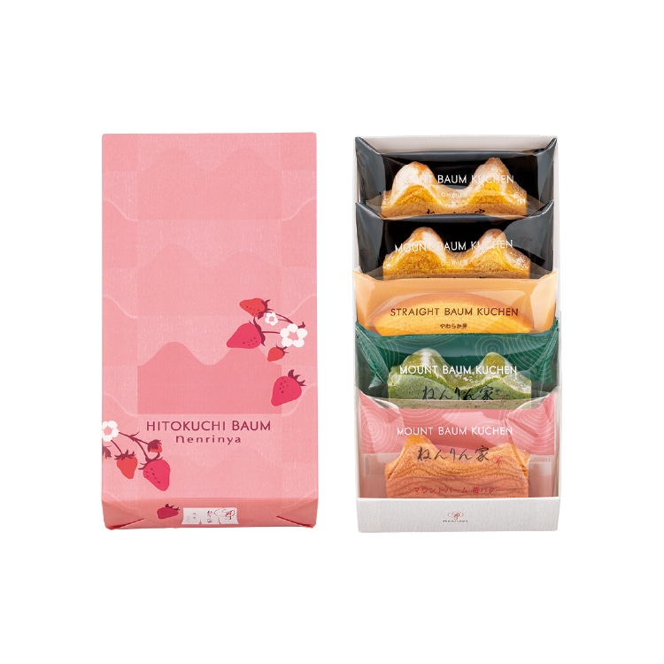 5個入〈ねんりん家〉を代表する2種の定番バームに、春限定の「マウントバーム 苺バター」、人気の「お抹茶」を詰合せたギフトボックス。単品購入はこちら