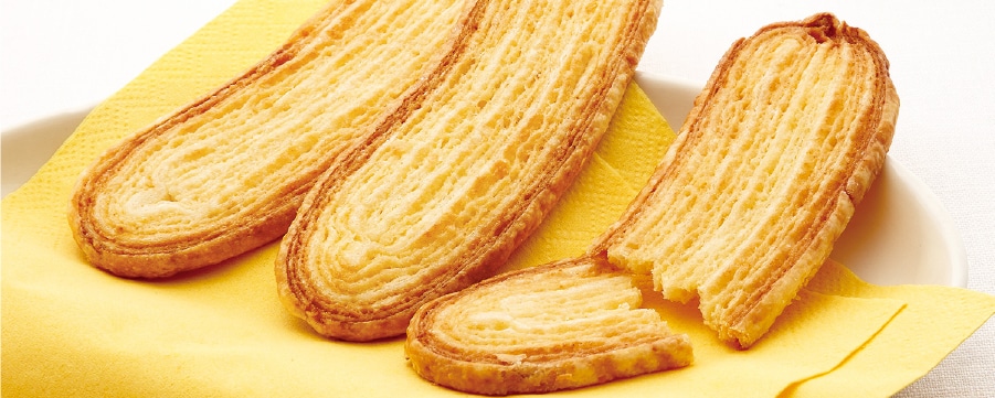 発酵バターたっぷりのパイ生地と、バナナ本来のおいしさを練り込んだクッキー生地を何層にも折りたたんで、サクサクッと香ばしく焼きあげました。