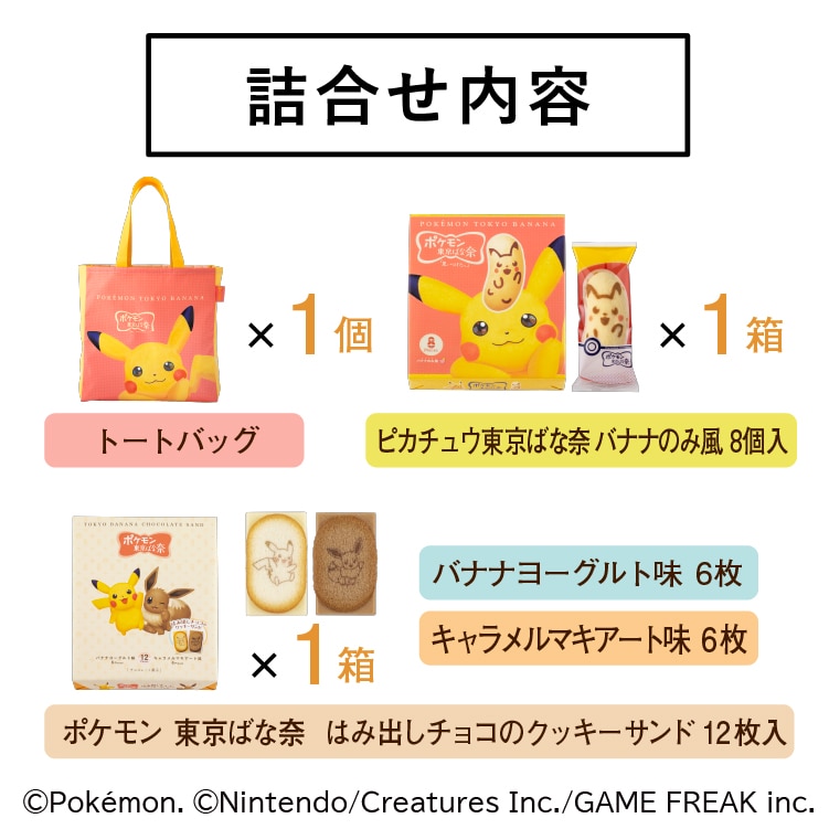 | 内容 | ●ピカチュウ東京ばな奈「見ぃつけたっ」バナナのみ風 8個入 ●ポケモン東京ばな奈 はみ出しチョコのクッキーサンド 12枚入 ●ポケモン東京ばな奈 ピカチュウトートバッグ 1個 ●ピカチュウマスキングテープ 1個 |