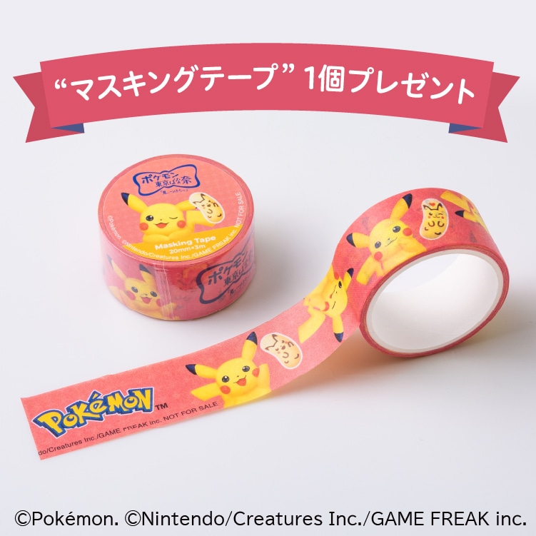 「ピカチュウ バッグセット」をお買い上げいただいた方に、マスキングテープ1個をプレゼント!パッケージとお揃いカラーのテープに、ピカチュウや「ピカチュウ東京ばな奈」が並んだデザインです。手帳やメモに貼れば、かわいさUP!