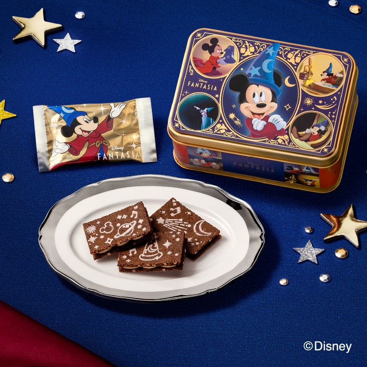 お菓子にも映画の世界観を詰め込みました。ディズニー映画『ファンタジア』公開85周年をお祝いする、夜空の星のように“ブロンド色”に輝くチョコレートをはさんだクッキーサンドです。まろやかにとろけるショコラとチョコナッツ生地の甘く香ばしいハーモニーを楽しんで!
