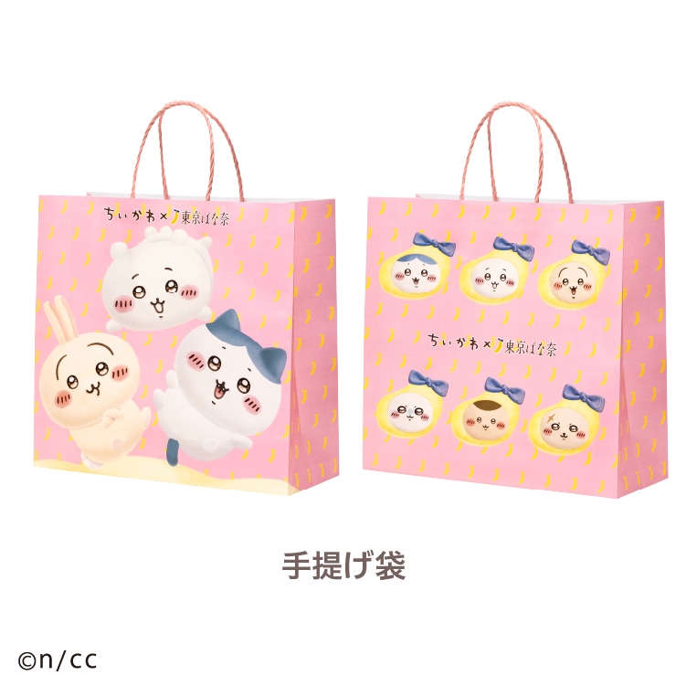 コラボを記念した特別なデザインの手提げ袋にも注目!表も裏も、ちいかわたちがたっぷりです。東京ばな奈のかぶりものをした、ちいかわたちのかわいい表情にも注目!