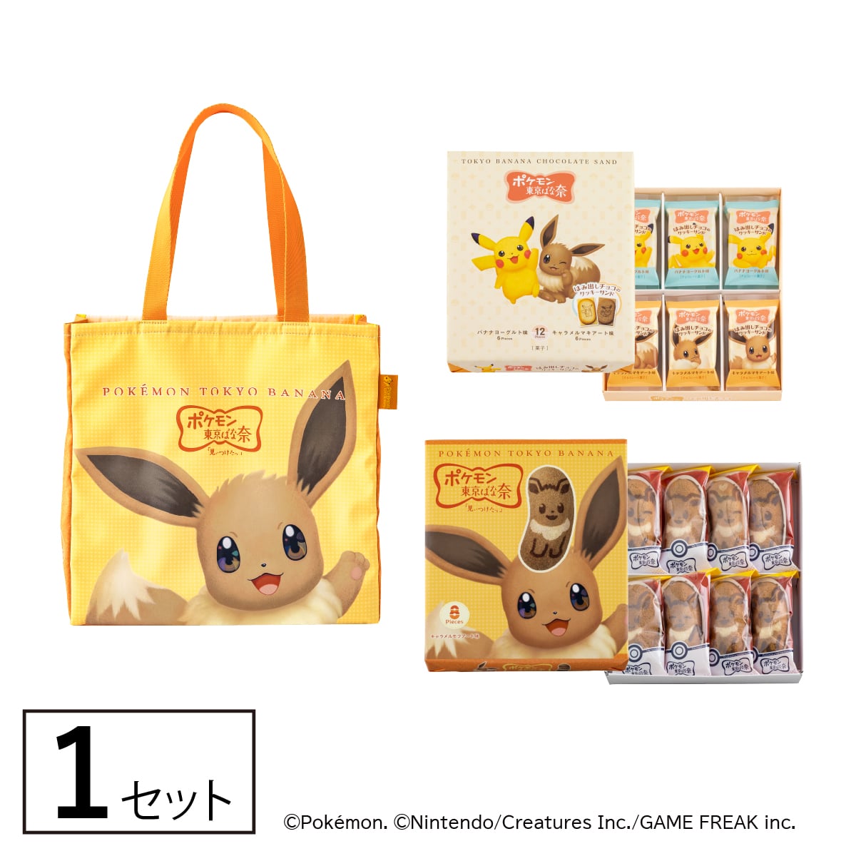 | 内容 | ●イーブイ東京ばな奈「見ぃつけたっ」キャラメルモフアート味 8個入 ●ポケモン東京ばな奈 はみ出しチョコのクッキーサンド 12枚入 ●ポケモン東京ばな奈 イーブイトートバッグ 1個 |