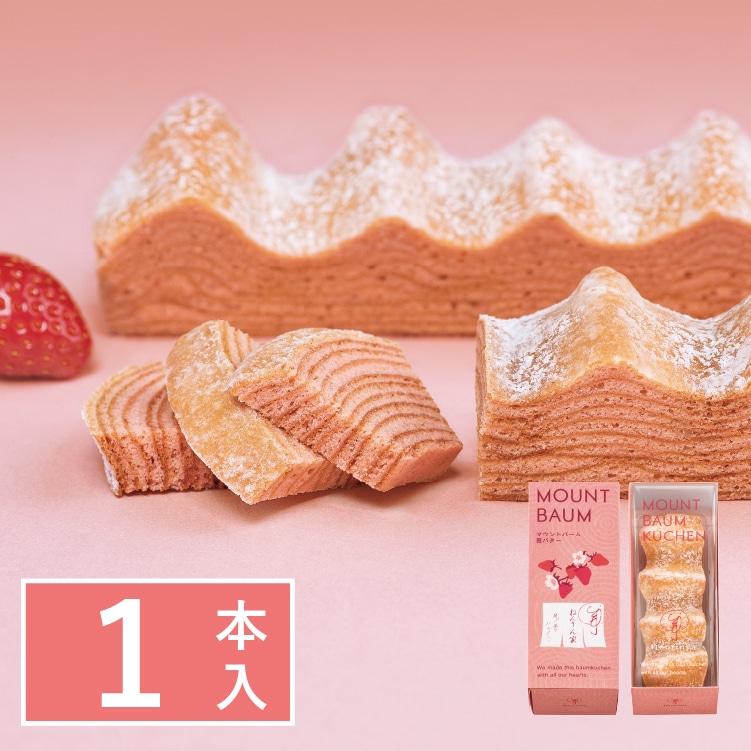 福岡県産あまおう苺のペーストとパウダーを練り込んだ生地を一層一層じっくり丁寧に焼きあげた、春色のバームクーヘン。ホワイトショコラをブレンドし、コク豊かでミルキーな味わいに。華やかな苺と芳醇バターの香りが広がる春限定の味をお楽しみください。