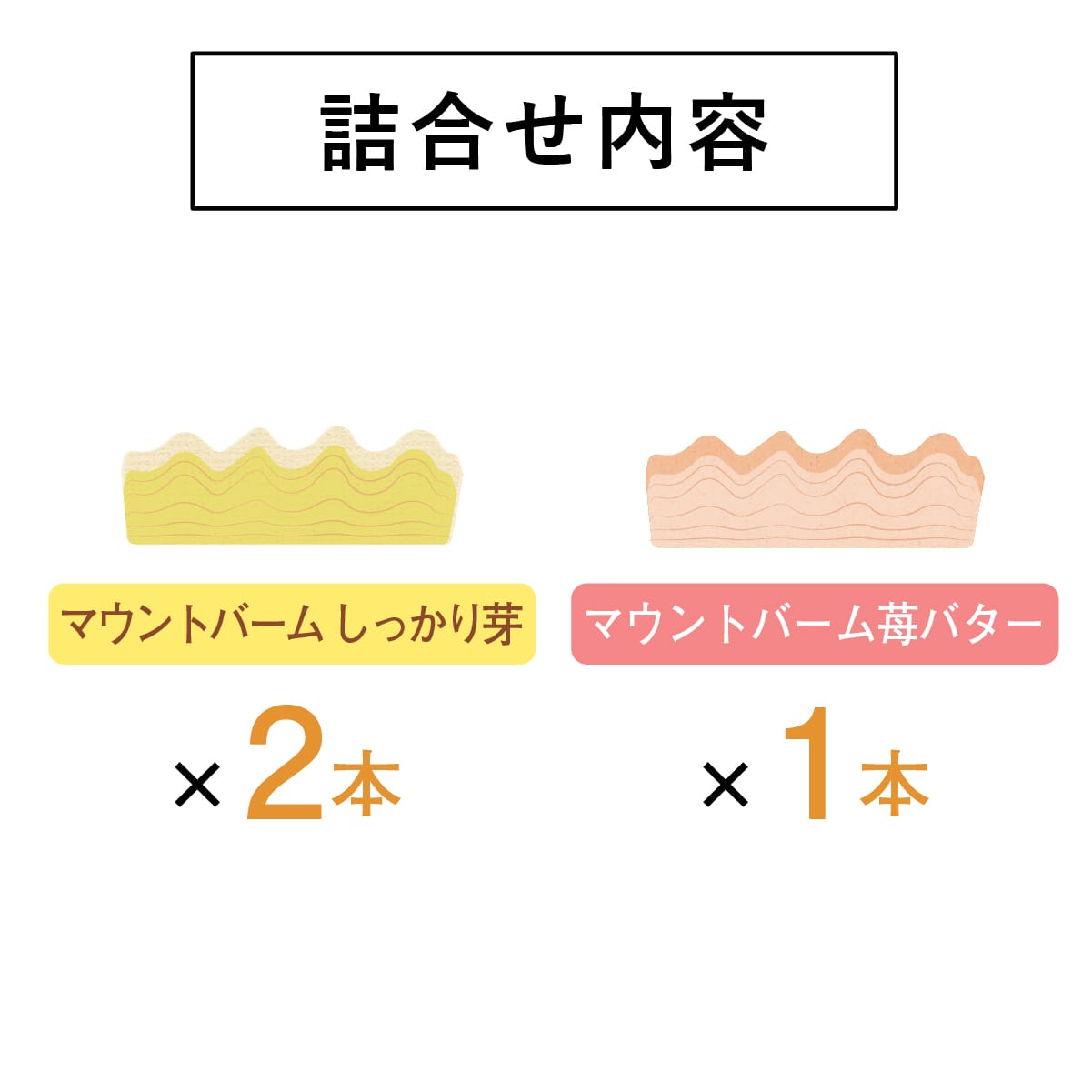 | 内容 | ●マウントバーム しっかり芽 2本 ●マウントバーム 苺バター 1本 |