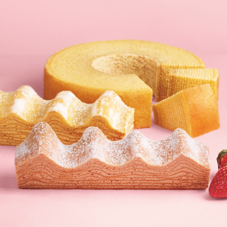 福岡県産あまおう苺のペーストとパウダーを練り込んだ生地を一層一層じっくり丁寧に焼きあげた、春色のバームクーヘン。ホワイトショコラをブレンドし、コク豊かでミルキーな味わいに。華やかな苺と芳醇バターの香りが広がる春限定の味をお楽しみください。
