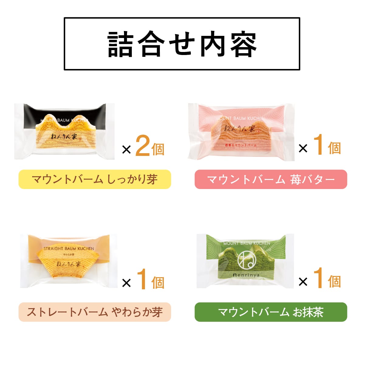 | 内容 | ●ひとくちマウントバーム しっかり芽 2個 ●ひとくちストレートバーム やわらか芽 1個 ●ひとくちマウントバーム お抹茶 1個 ●ひとくちマウントバーム 苺バター 1個 |