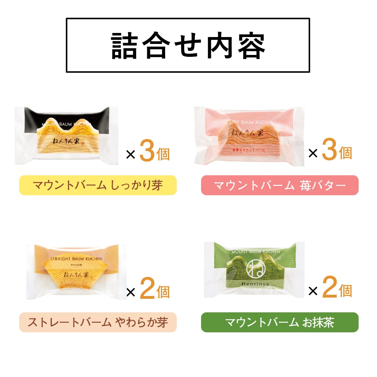 | 内容 | ●ひとくちマウントバーム しっかり芽 3個 ●ひとくちストレートバーム やわらか芽 2個 ●ひとくちマウントバーム お抹茶 2個 ●ひとくちマウントバーム 苺バター 3個 |