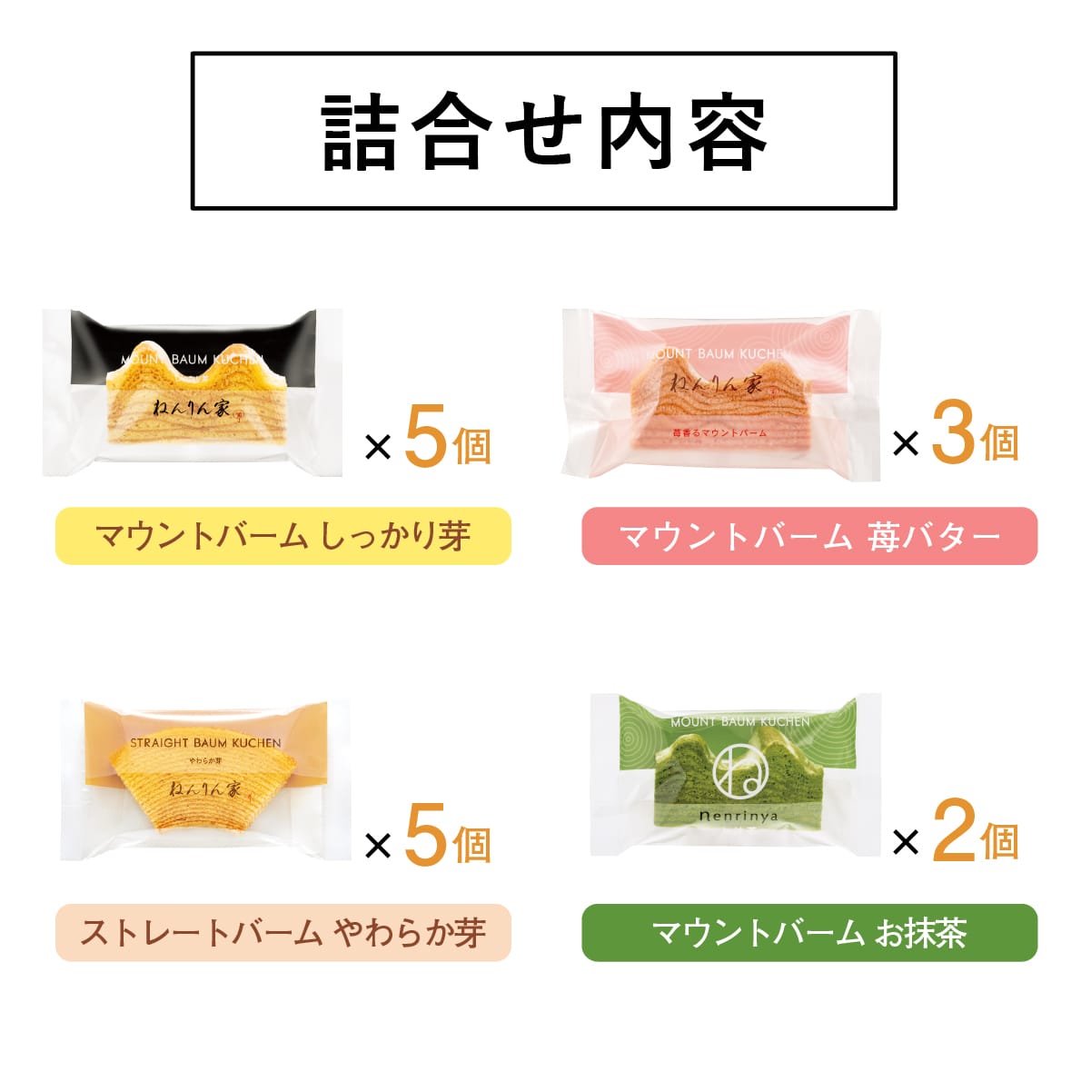 〈ねんりん家〉を代表する2種の定番バームに、春限定の「マウントバーム 苺バター」、人気の「お抹茶」を詰合せたギフトボックス。食べやすいひとくちサイズのバームクーヘンは、食べ比べや贈り物にもおすすめです。