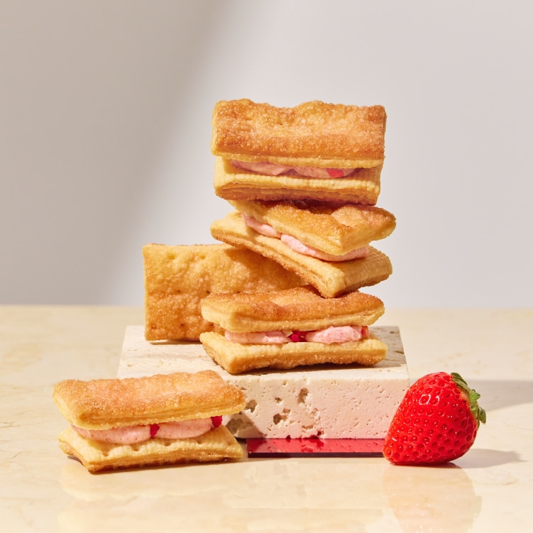 いちごスイーツ専門店が作りあげたカスタード香るこだわりのいちごクリームを、香ばしいパイで頬張る『いちごクリームパイ』。いちごを最高に楽しむ“ナポレオンパイ”から着想を得て、皿盛りの美味しさを超えていく一体感のある味わいを目指しました。